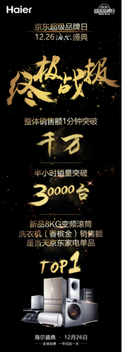 12月27日0点,京东超级品牌日 ·海尔32周年盛典顺利收官。数据显示,活动于26日 0点上线后,海尔京东官方旗舰店销售额1分钟突破千万,半小时销量破3万台,新品8KG香槟金变频滚筒洗衣机销售额更是成为当天京东家电品类的单品TOP1。在双11之后再掀一轮网购高潮,为2016年打了一个漂亮的收官战。在电商竞争如此激烈的市场环境下,海尔能够屡创新高,与其由突破产品思维,专注能过户体验密不可分。