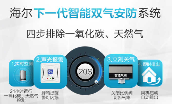 针对上一代燃气热水器在防一氧化碳中毒方面的不足,海尔热水器与美国霍尼韦尔公司联合攻克了燃气热水器在一氧化碳和甲烷监测方面的技术难关,借助载人航天飞船环境控制和生命保障系统的灵感,将航天科技民用化,成功研发出了“海尔下一代智能双气安防系统”。
