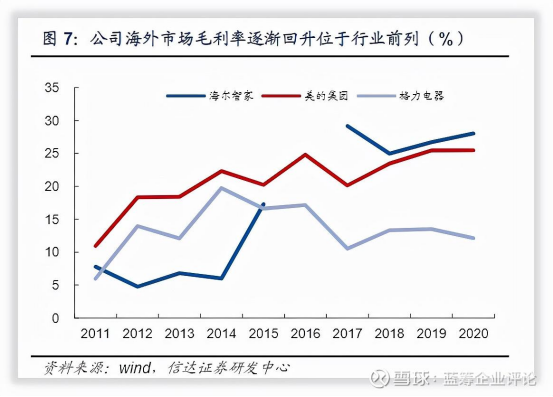 根据信达证券的统计数据,在2015年前海尔智家的海外市场毛利率还落后于国内的美的集团与格力电器(000651.SZ),但自2017年起,经过进一步对海外业务的整合,海尔智家海外市场毛利率稳步回升,目前已领先于美的集团,并与格力电器拉开明显距离。根据同花顺iFinD数据,2020年美的海外业务毛利率为25.45%。同期,海尔智家海外业务毛利率为28.01%,明显领先美的集团。