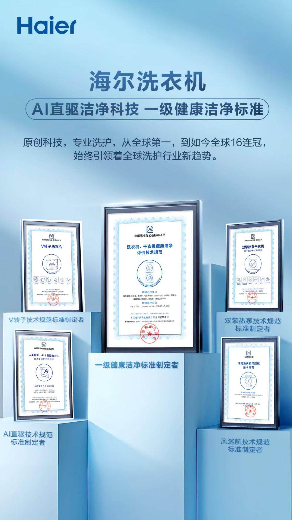 在健康洁净领域,海尔早先就主导制定《健康洁净标准》,填补了行业空白。今年进一步升级,先后主导制定《AI直驱洗衣机标准》、《滚筒洗衣机风巡航功能技术规范》等多项标准,在AI应用、创新技术与产品等多个领域做出表率,并为行业的升级进化指明了方向。
