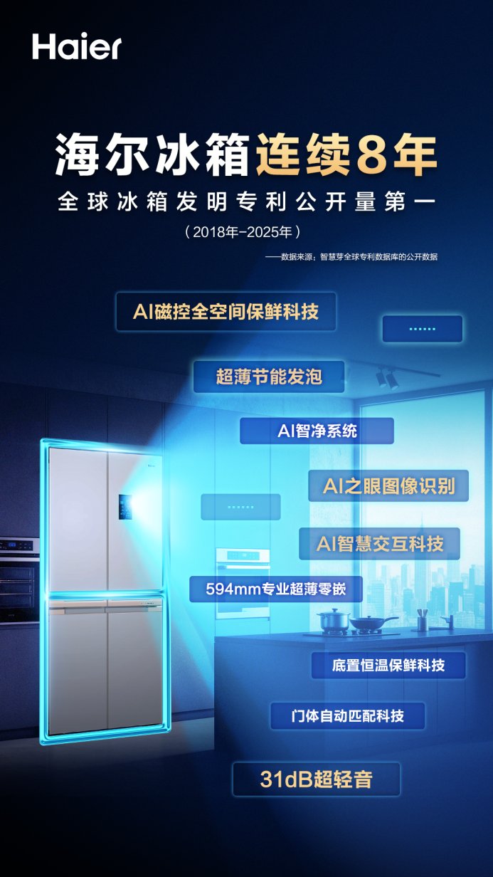 这份系统布局的广度,最直观的衡量标尺便是专利。智慧芽全球专利数据库显示,2025年冰箱行业专利公开量榜首是海尔冰箱,以1926件实现全球8连冠。