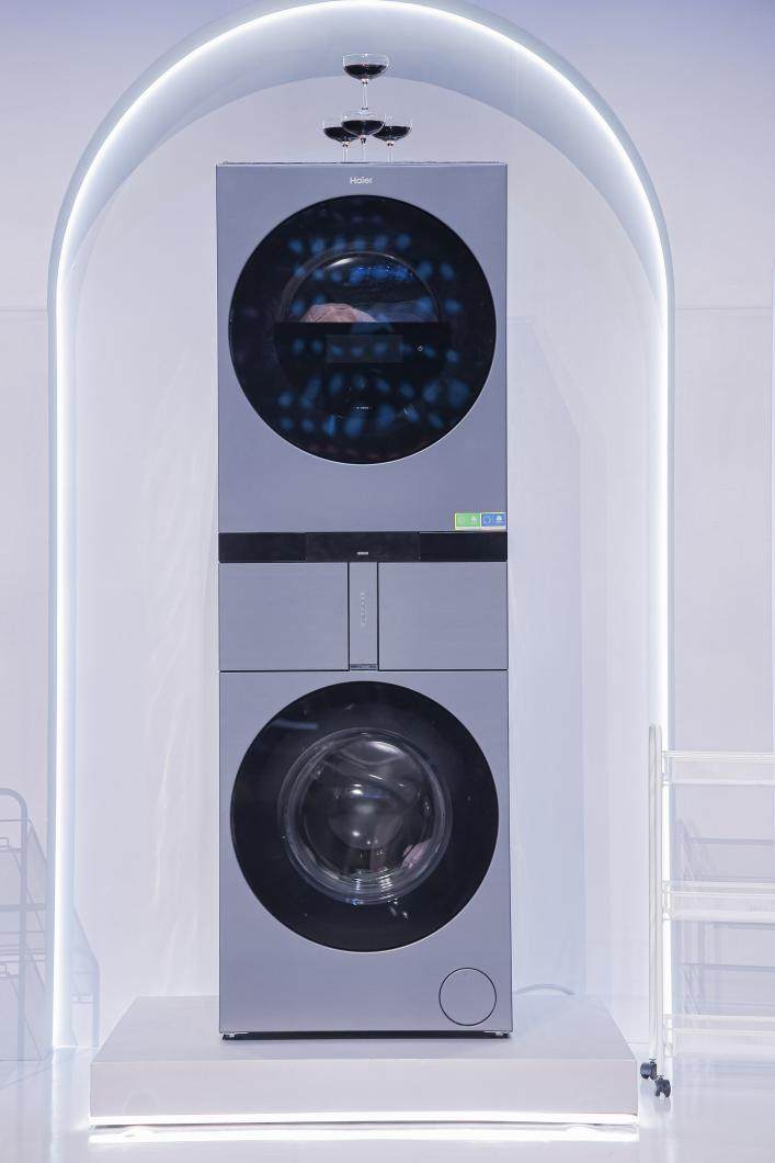 与洗衣机行业惯用的空筒测试不同,海尔集团董事局主席、首席执行官周云杰选择了更难的实测:不玩空转,而是将四个筒全部塞入湿衣物。随着四个筒同时启动、转速拉满,洗衣机顶部的香槟塔纹丝不动,杯中水面稳如镜面。
