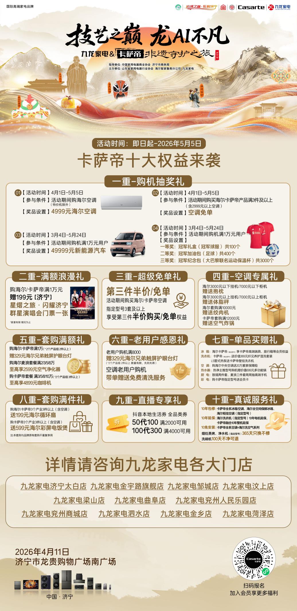 领导嘉宾齐聚,共启非遗科技盛典;杂技《顶凳・中国龙》高能上演,演绎力量与匠心;晚 19:30 晚场盛典,重磅明星亲临献唱,互动抽奖不停。活动期间(即日起至 5 月 5 日),到九龙家电各大门店参与活动,十重权益让你享够实惠!