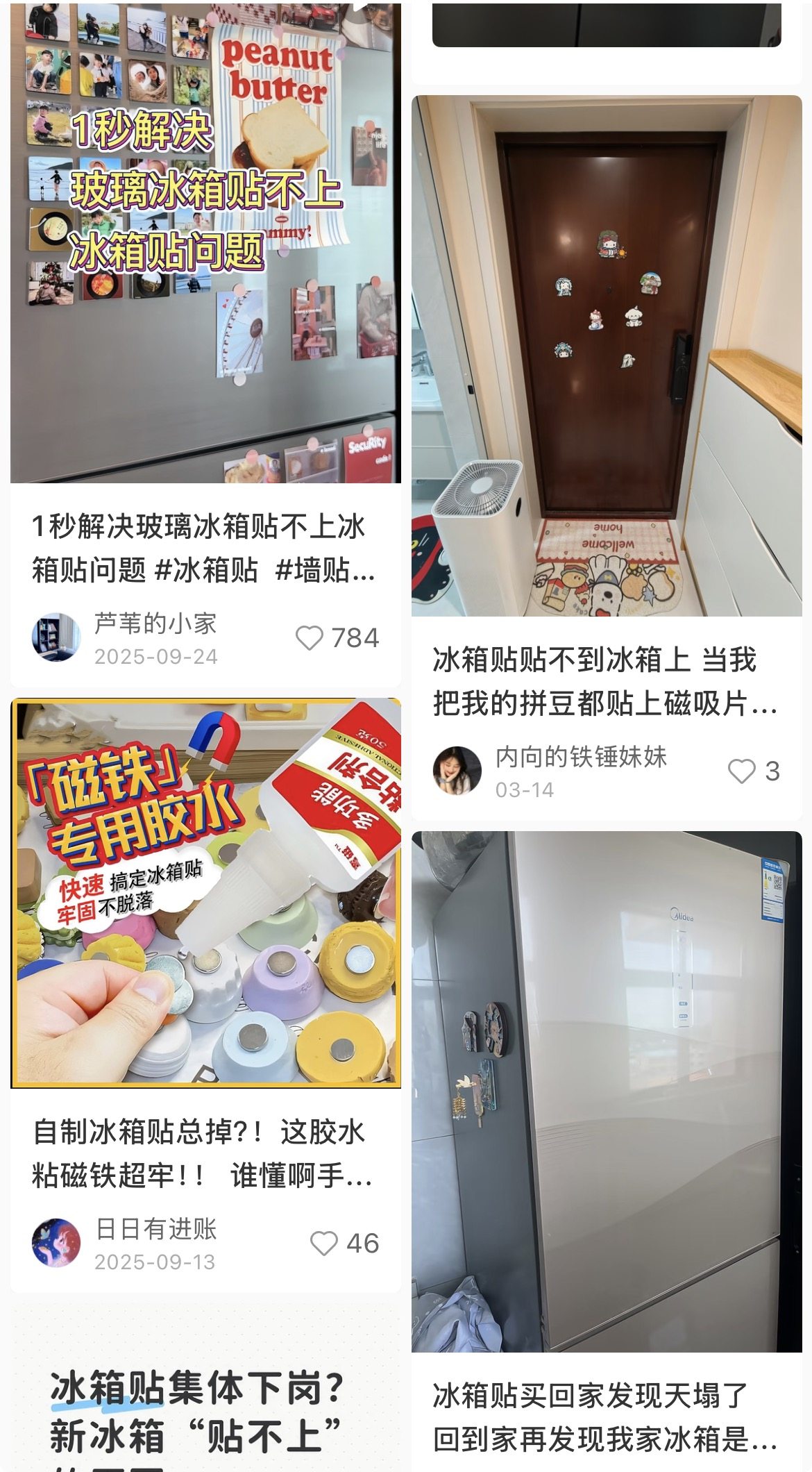 实际上,若你打开小红书、抖音等社交平台,搜索“玻璃面板冰箱怎么贴冰箱贴”,会发现相关话题浏览量已突破4.1亿次。无数网友在评论区求支招,甚至讨论如何用纳米胶、引磁片等方式来弥补这个缺憾。
