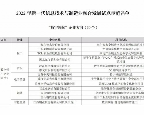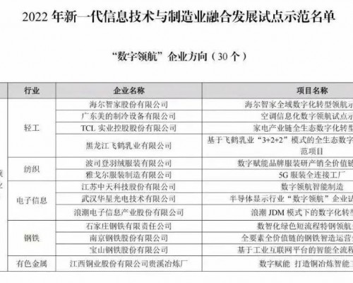 10月31日,工业和信息化部公示了2022年新一代信息技术与制造业融合发展试点示范名单。本次示范名单首次围绕数字领航方向遴选出企业30家,涉及轻工、纺织、电子信息、钢铁、有色金属、石化化工、建材、装备制造、...